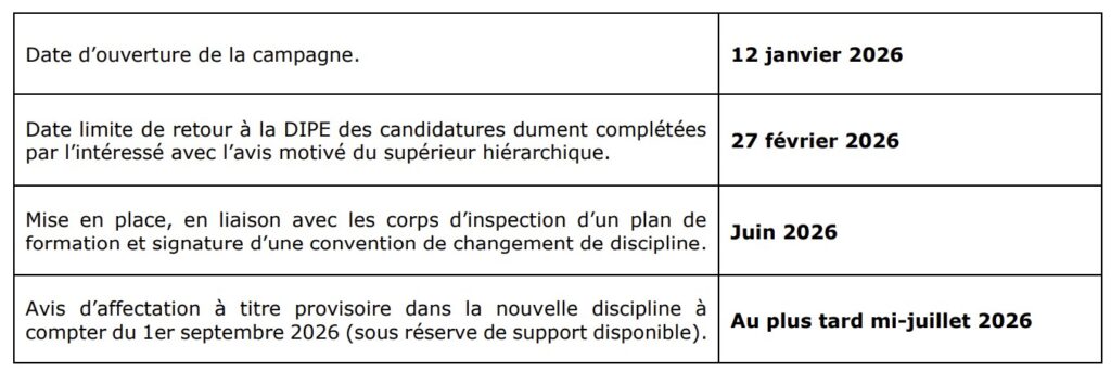 La campagne de changement de discipline est ouverte depuis le 12 janvier 2026. Les candidatures complètes, accompagnées de l’avis motivé du supérieur hiérarchique, doivent être transmises à la direction des personnels enseignants au plus tard le 27 février 2026. La mise en place des plans de formation et la signature des conventions de changement de discipline sont prévues en juin 2026. Les avis d’affectation à titre provisoire dans la nouvelle discipline interviendront au plus tard à la mi-juillet 2026, pour une prise d’effet au 1er septembre 2026.