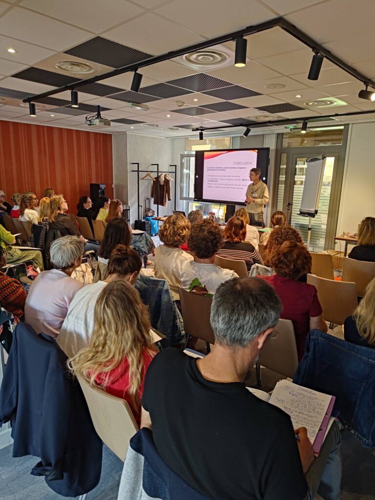 L’invitée du jour, Valérie Blondel, autrice de Osez écrire et enseignante à l’université de Bâle, a proposé une intervention particulièrement appréciée. Elle a présenté des outils concrets et des approches permettant de redonner aux élèves le goût d’écrire.